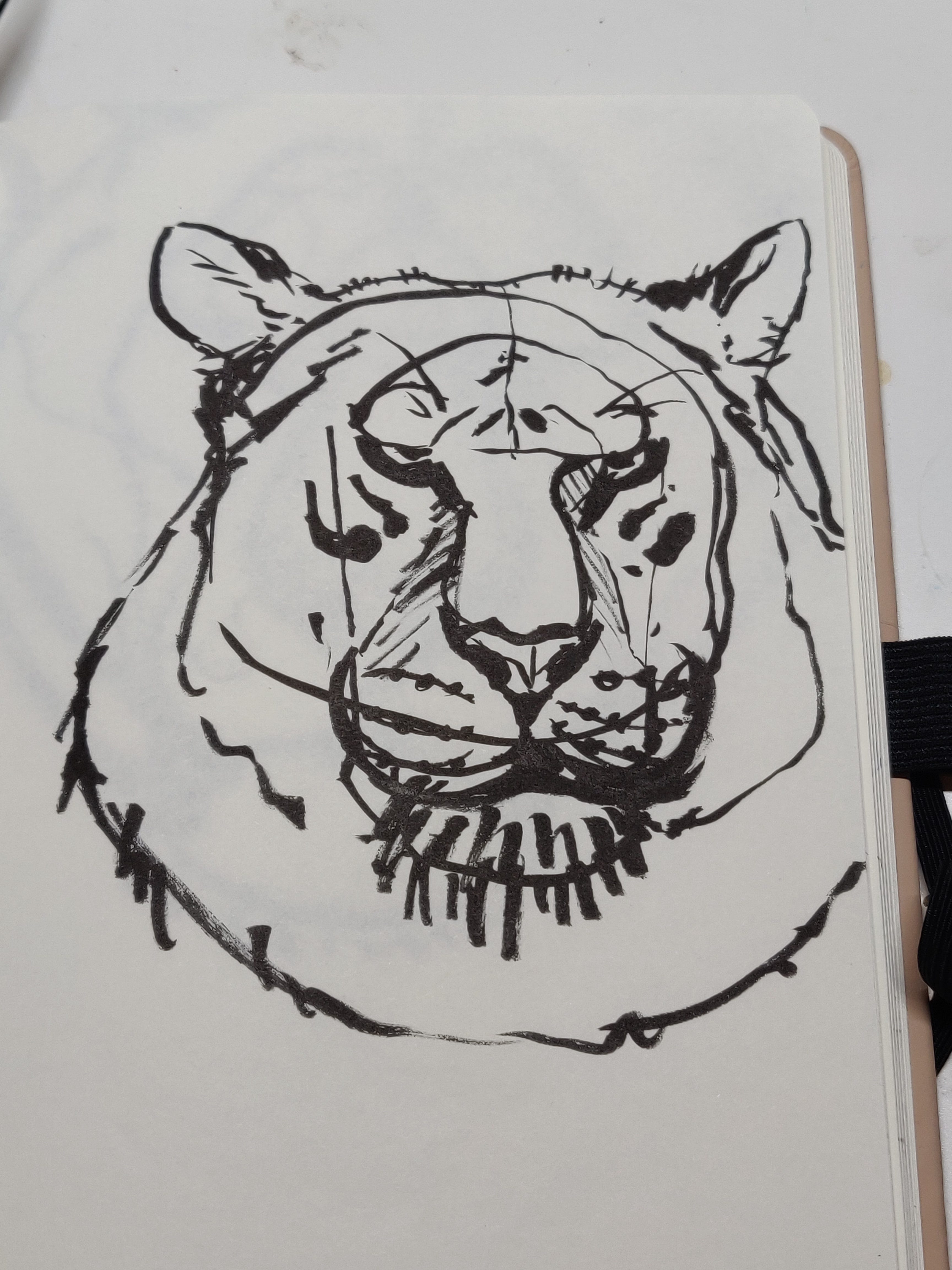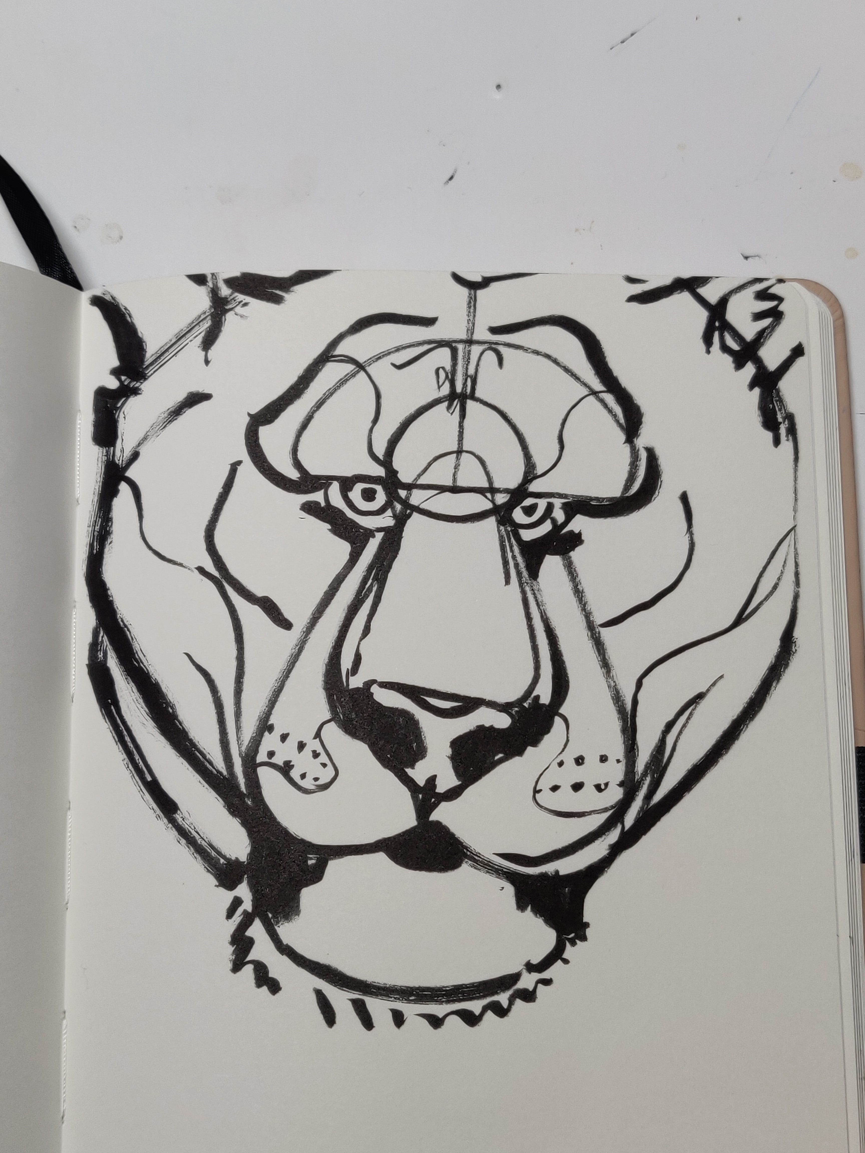 So I decided to take the plunge and go with my gut feeling to invest in his teaching methodology. I began by watching the first part of “Animal Character design with David Colman” , “01 tiger studies and shape exploration”. In this he breaks down the facial features of a tiger from references and makes some really interesting obeservations of shape that are less obvious. Here is some work in reaction to what I watched.
